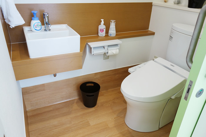 待合室奥にトイレもご用意しております。広めに作っておりますので、動物を連れて入っていただけます。